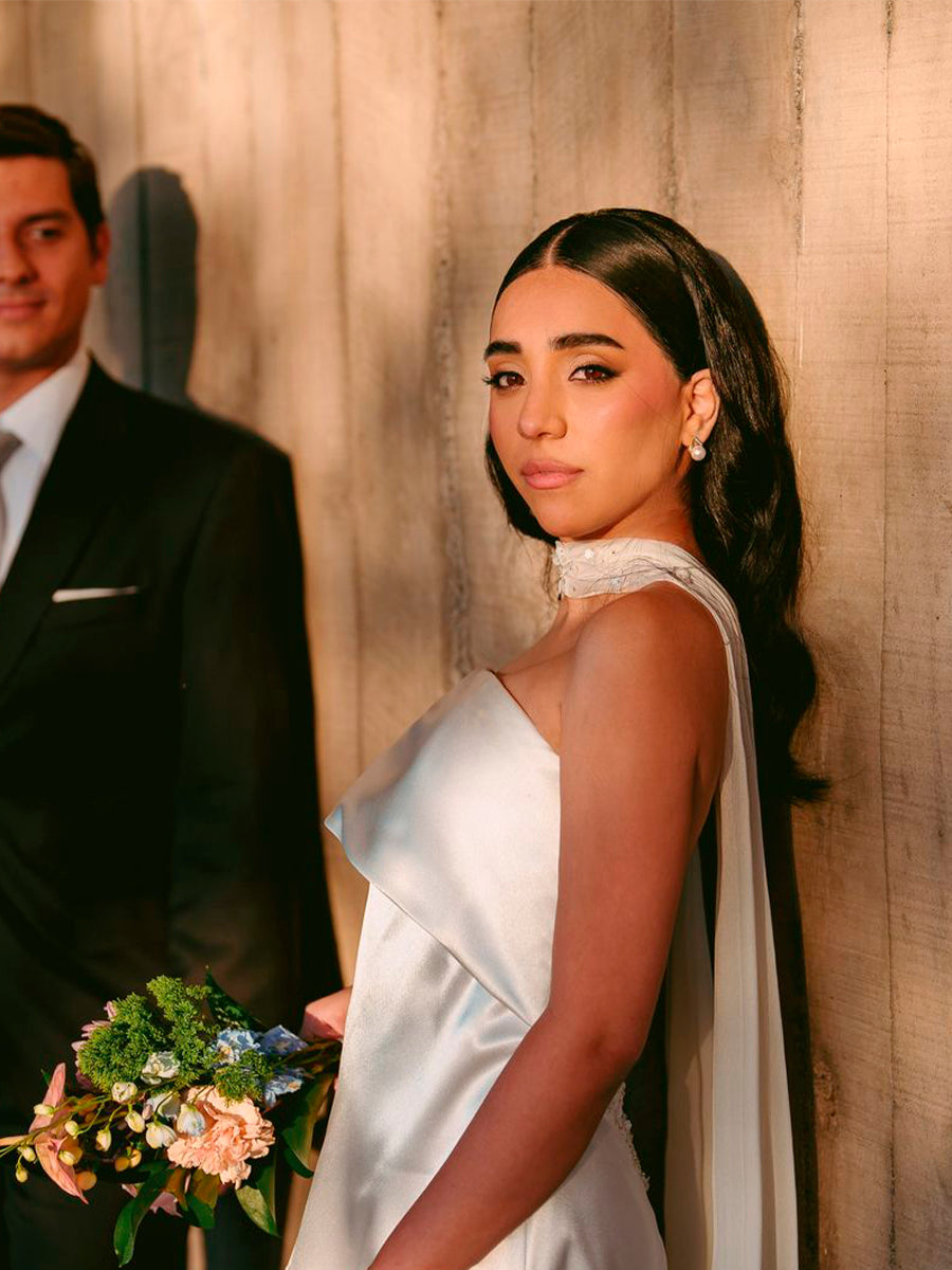 Un vestido dulce y elegante para esta novia de cuento, con la que gozamos y trabajamos un vestido con detalles de drapeados y gasa, en el que gozó de su día.
